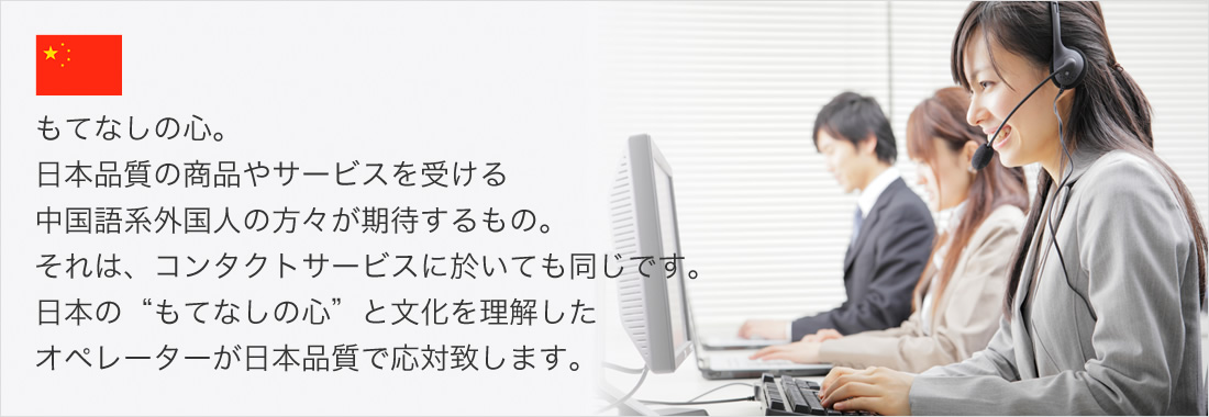 Open が提案する中国コールセンターは“日本文化を充分理解した日本品質”のコンタクトサービスを提供致します。日本人が持つもてなしの心を学び、ホスピタリティ精神を備えた、ネイティヴの中国語オペレーターが旅行者や消費者に対して“言葉の壁” を乗り越え、細やかな配慮の行き届いた案内を提供致します。